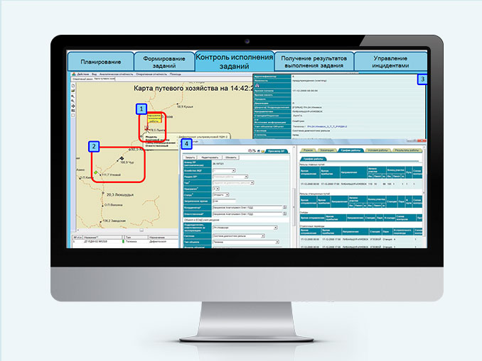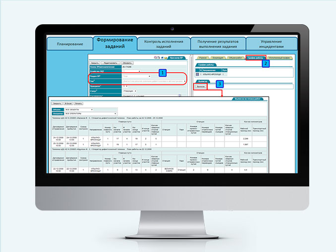 Модуль планирования (Формирование и согласование месячных планов работ с последующим созданием суточных заданий на их основе, контроль своевременности диагностики объектов на всех уровнях управления путем консолидации информации различных диагностических систем);